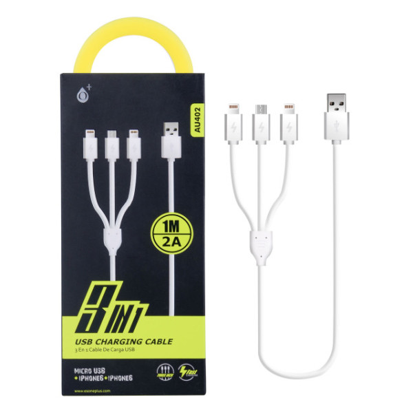 USB nabíjecí kabel 3 v 1, délka kabelu 1m, 2A, tři koncovky: 1x Micro USB + 2x iPhone Lightning, podporuje rychlé nabíjení. Můžete tak například nabíjet až tři přístroje najednou.