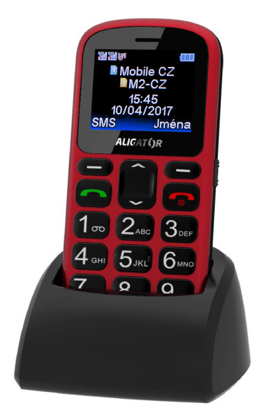Klasický telefon pro seniory se SOS tlačítkem, možností obrázkového tel. seznamu, funkcí určení polohy SOS locatora podporou dvou SIM karet. Ve třech barvách, černo-šedá, bílo šedá a červeno-černá . Stojánek je součástí balení.