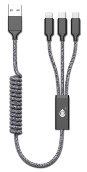 USB nabíjecí kabel 3 v 1, díky systému natahovací spirály dosahuje délky až 1,2m a zároveň v nenataženém stavu zabírá minimálně místa. Spojuje tři nejžádanější kabely na trhu. Baleno v elegantní krabičce.