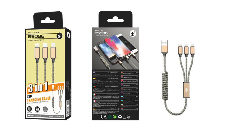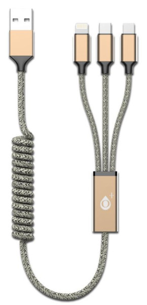 USB nabíjecí kabel 3 v 1, díky systému natahovací spirály dosahuje délky až 1,2m a zároveň v nenataženém stavu zabírá minimálně místa. Spojuje tři nejžádanější kabely na trhu. Baleno v elegantní krabičce.