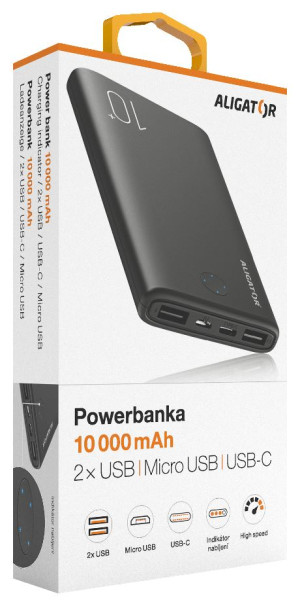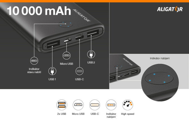 Kapacita 10 000 mAh Vás nezklame ani na dlouhých cestách a zcela postačí pro vícenásobné dobití telefonu. O stavu nabité baterie vás pak budou informovat LED diody, které najdete na horní straně.