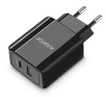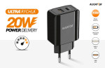 Výkonná miniaturní síťová nabíječka řady „POWER DELIVERY“ v elegantním černém provedení s USB-A portem a ultra rychlým USB-C portem o výkonu 20W.
