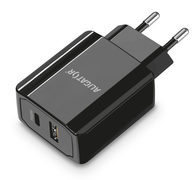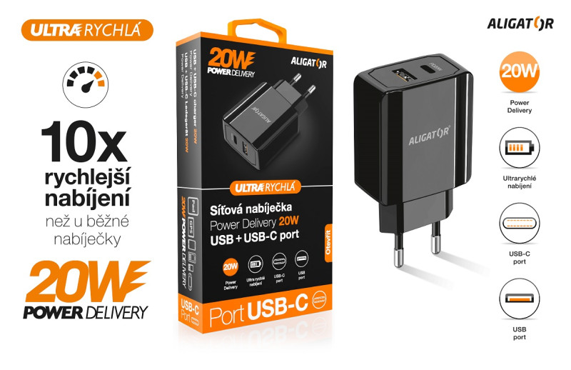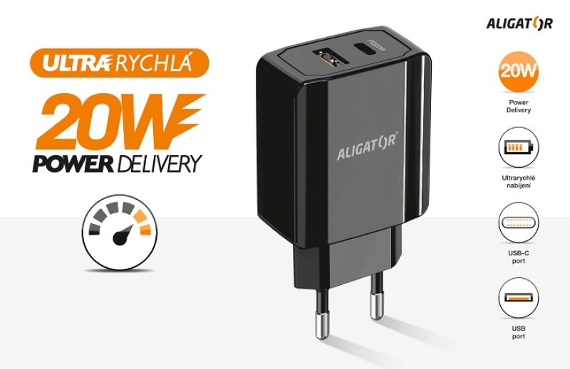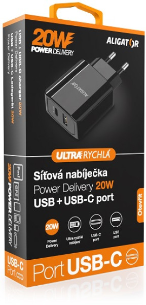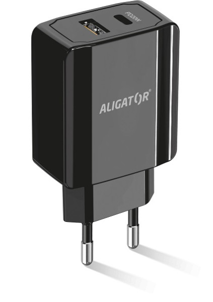 Rychlá síťová nabíječka USB-C + USB ALIGATOR Power Delivery 20W