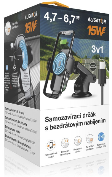 Samozavírací držák do auta s bezdrátovým nabíjením Aligator 3v1. Rychlé bezdrátové nabíjení chytrého telefonu o výkonu 15W a samozavírací ramena, která pomocí snímače automaticky sevřou mobilní telefon a zajistí ho v nejlepší možné poloze pro nabíjení.