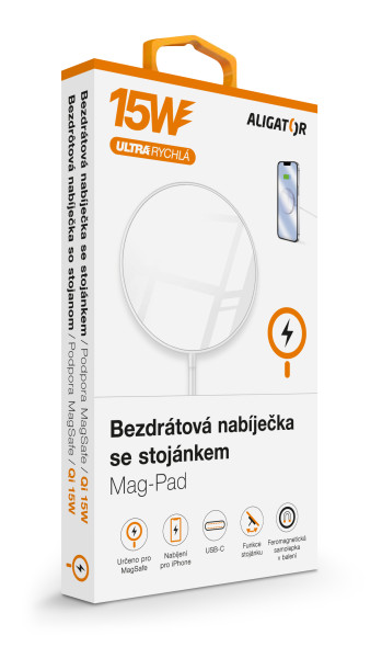 Kompaktní zpracování v elegantní bílé barvě se zářivě lesklým povrchem, praktickým stojánkem a 1m dlouhým přívodním USB-C kabelem, to je bezdrátová nabíječka Aligator Mag-Pad. Součástí balení je také feromagnetická samolepka, díky které můžete rozšířit kompatibilitu u pouzder, které tuto technologii nepodporují.