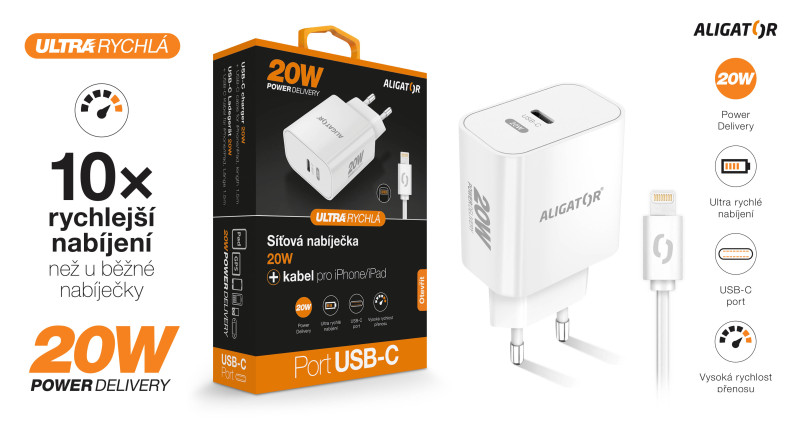 Rychlá síťová nabíječka USB-C ALIGATOR Power Delivery 20W s kabelem USB-C/Lightning pro iPhone/iPad