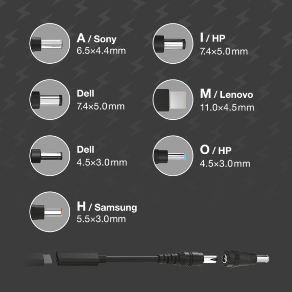 Tento adaptér je ideálním pomocníkem pro dobíjení velké části notebooků a ultrabooků. Pečlivě jsme si dali záležet při výběru typů konektorů. Vyberte si jeden ze 7 přiložených konektorů (koncovek), který bude vhodný pro nabíjení Vašeho zařízení.