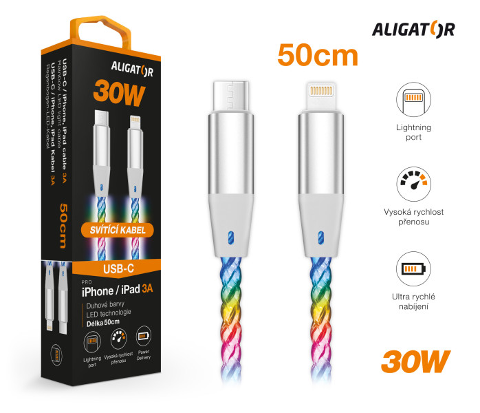 Duhově svítící LED kabel řady ALIGATOR POWER s kovovými konektory USB-C/Lightning nejvyšší kvality, o výkonu 30W a možností nabíjení až 3A.