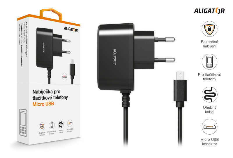 Síťová Micro-USB nabíječka ALIGATOR pro všechny seniorské a tlačítkové telefony ALIGATOR