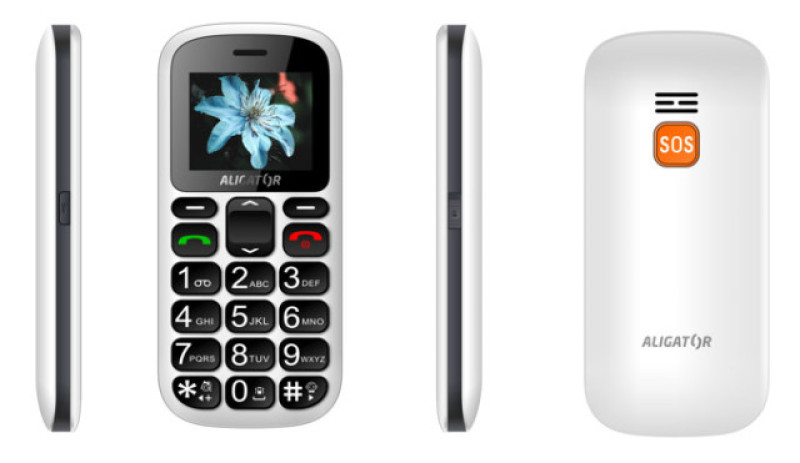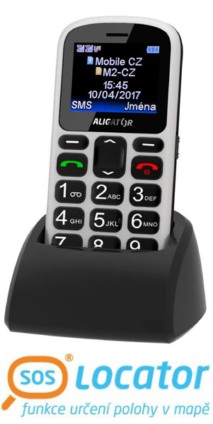 Klasický telefon pro seniory se SOS tlačítkem, možností obrázkového tel. seznamu, funkcí určení polohy SOS locatora podporou dvou SIM karet. Ve třech barvách, černo-šedá, bílo šedá a červeno-černá . Stojánek je součástí balení.