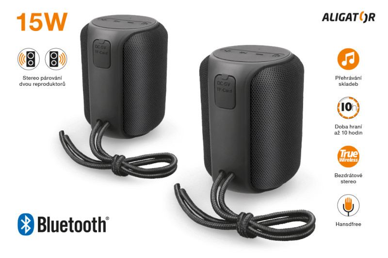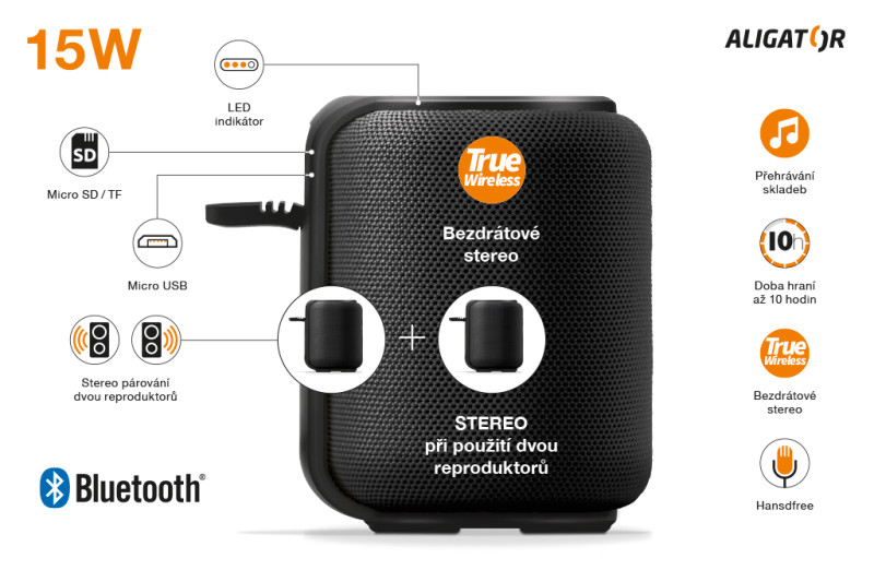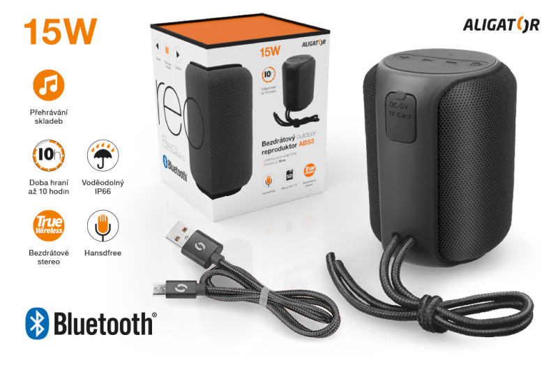 Elegán s duší outdooru! To je Bluetooth reproduktor ALIGATOR ABS3 s fantastickým výkonem 15W! Možnost vložení micro SD karty a funkce Handsfree je samozřejmostí. Co ale samozřejmostí rozhodně není je funkce STEREO – připoj si 2! Udělejte si pomocí dvou reproduktorů ALIGATOR ABS3 úžasné STEREO s výkonem 30W!