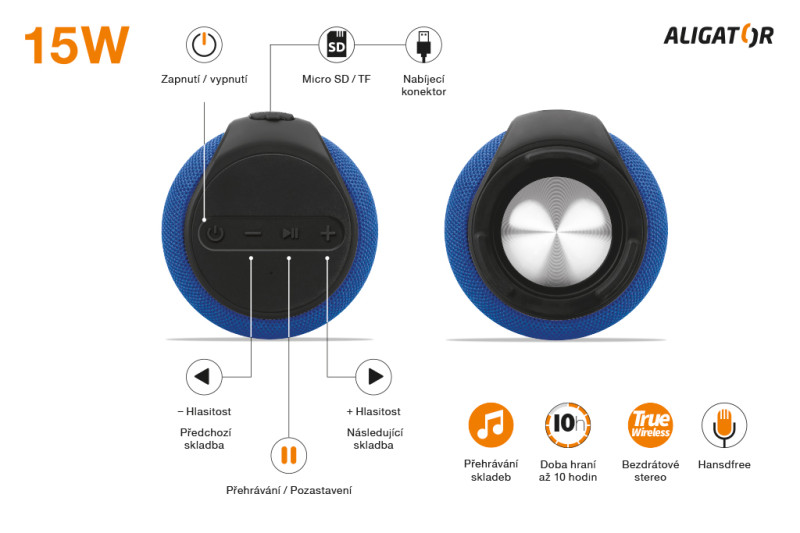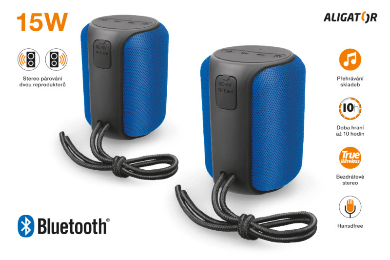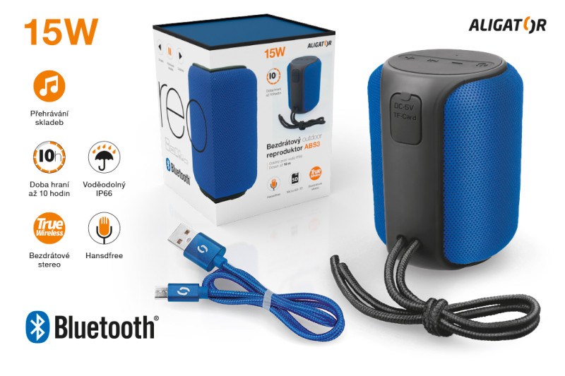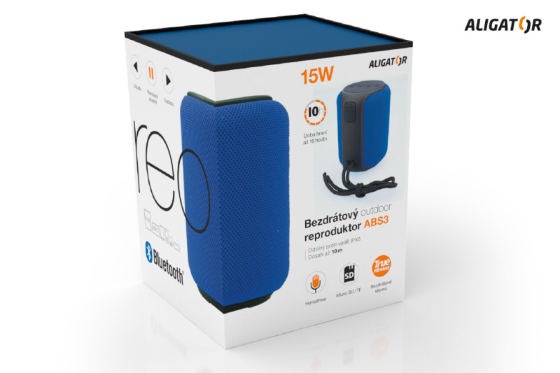 Elegán s duší outdooru! To je Bluetooth reproduktor ALIGATOR ABS3 s fantastickým výkonem 15W! Možnost vložení micro SD karty a funkce Handsfree je samozřejmostí. Co ale samozřejmostí rozhodně není je funkce STEREO – připoj si 2! Udělejte si pomocí dvou reproduktorů ALIGATOR ABS3 úžasné STEREO s výkonem 30W!