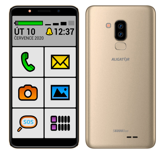 Štíhlé tělo s úzkými okraji dokonale ladí se zaoblenými hranami. Povrch je metalický, ve třech barevných odstínech. Elegantní černá, svěží modrá metalíza nebo exkluzivní zlatá metalíza. S6000 Senior vzhledově dokonale splyne s ostatními smartphony, takže na první pohled ani nepoznáte, že se jedná o speciální model pro seniory.