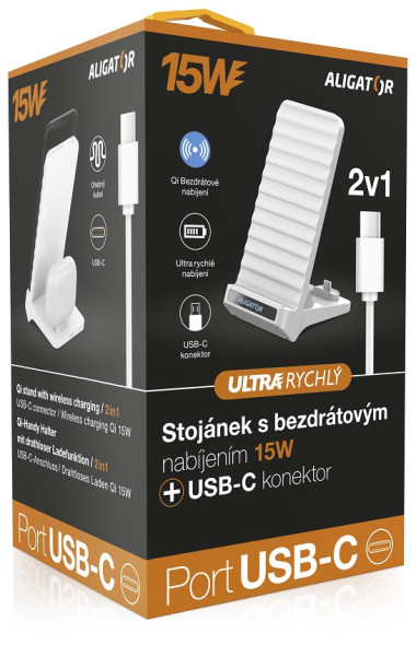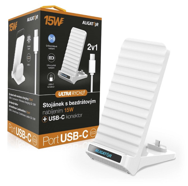 Stojánek s bezdrátovým nabíjením Aligator 2v1. Rychlé bezdrátové nabíjení chytrého telefonu o výkonu 15W a USB-C konektor pro nabíjení True Wireless sluchátek a drobného příslušenství.