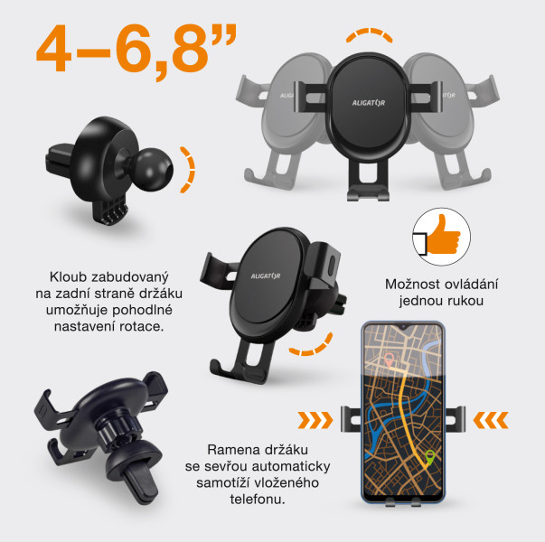 Gravitační univerzální držák pro mobilní telefony do auta ve velmi elegantním provedení nebrání řidiči ve výhledu a je kompatibilní s většinou mřížek ventilátorů.
