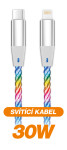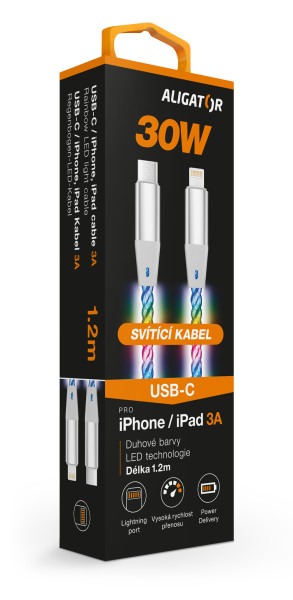 Duhově svítící LED kabel řady ALIGATOR POWER s kovovými konektory USB-C/Lightning nejvyšší kvality, o výkonu 30W a možností nabíjení až 3A.
