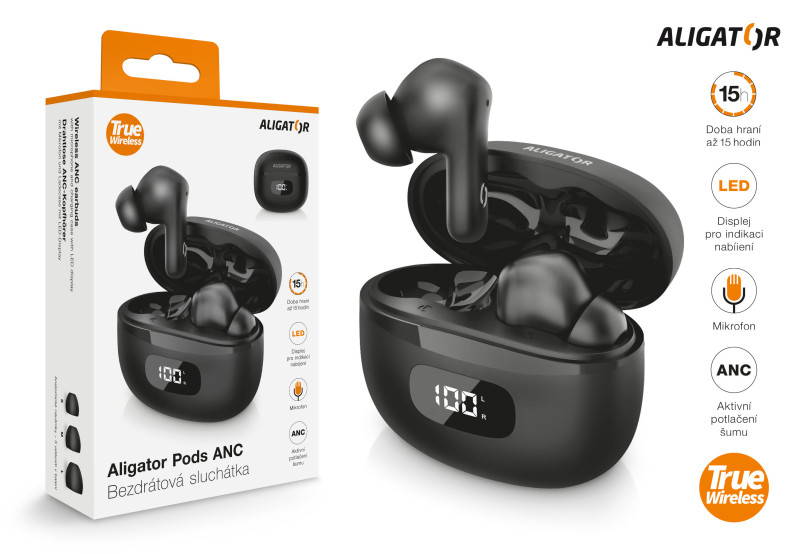 | Obsah balení: | Bluetooth sluchátka Aligator Pods ANC Nabíjecí pouzdro s LED displejem Nabíjecí USB-C kabel 3 velikosti náušníků Návod k použití |