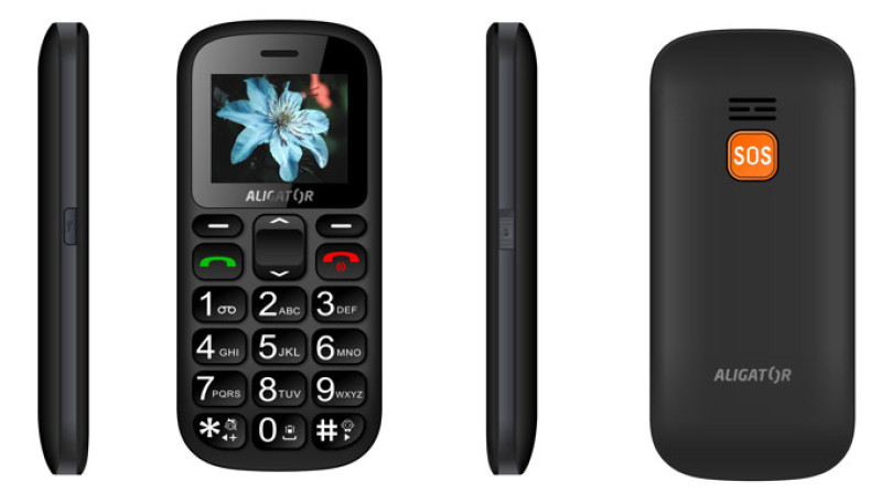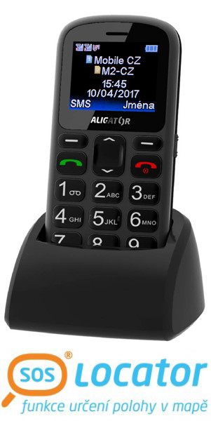 Klasický telefon pro seniory se SOS tlačítkem, možností obrázkového tel. seznamu, funkcí určení polohy SOS locatora podporou dvou SIM karet. Ve třech barvách, černo-šedá, bílo šedá a červeno-černá . Stojánek je součástí balení.
